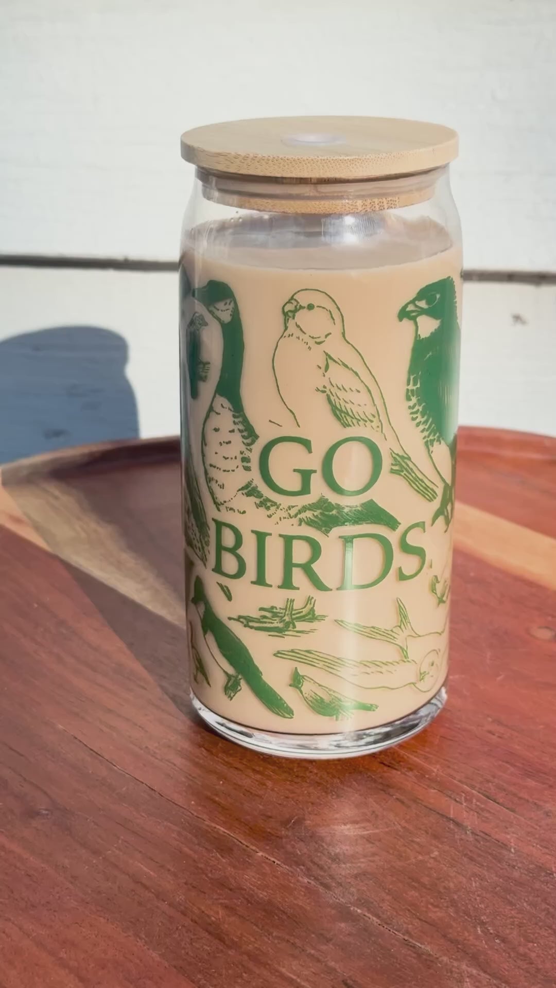A 20 oz drinking glass perfect for a beer or a coffee/smoothie on the go with bird illustrations that says 'go birds.' Bamboo lid included! The glass is dishwasher safe but hand washing is recommended.