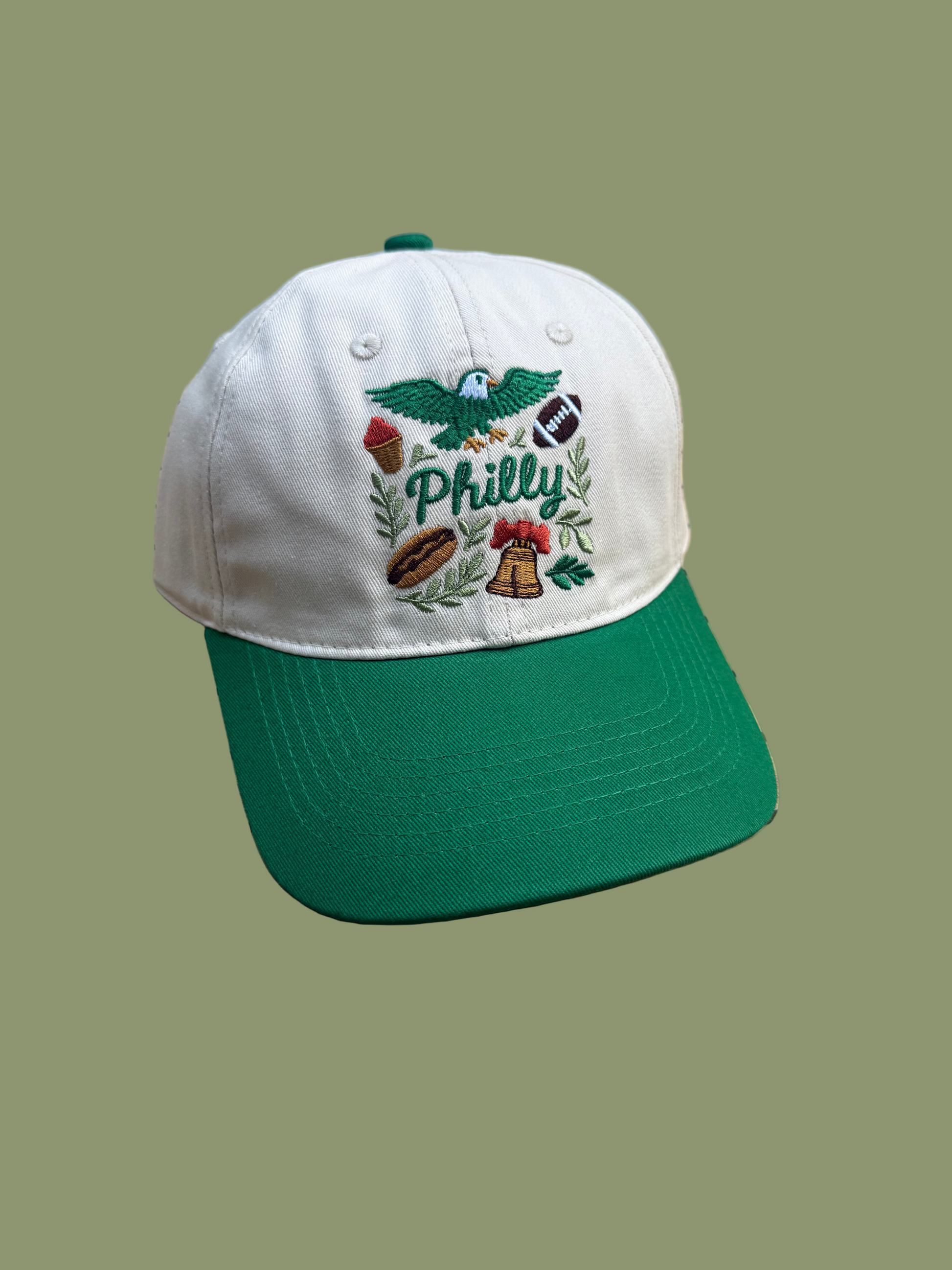 A baseball hat that highlights most of what Philly is known for...history, cheesesteaks, "wooder" ice, and football. Show your love for The City of Brotherly love with this adjustable baseball hat that is perfect for wearing on game days.