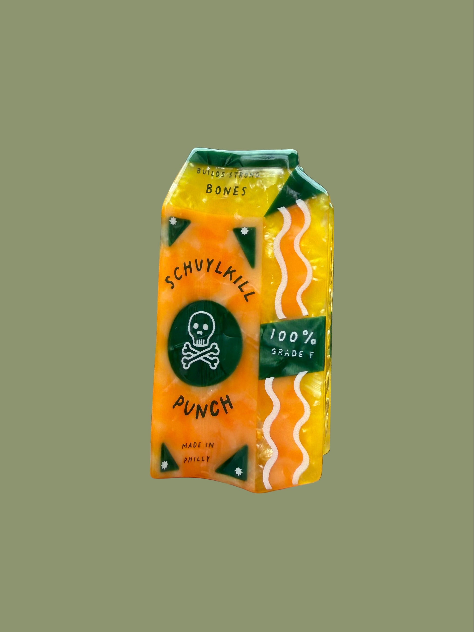 Show what is running through your veins with this cute Schuylkill Punch hair clip that lists the facts: Builds strong bones, 100% grade F, made in Philly